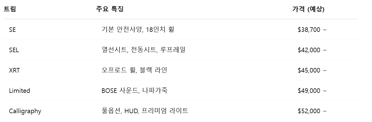 2025 팰리세이드는 미국 기준으로 SE, SEL, XRT, Limited, Calligraphy의 다섯 가지 트림으로 구성된다.