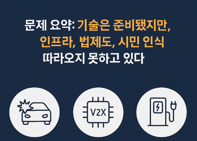 👉 문제 요약: 기술은 준비됐지만, 인프라, 법제도, 시민 인식이 따라오지 못하고 있다.
